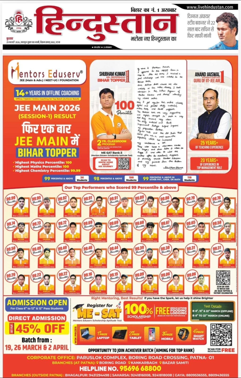 Bihar Topper in JEE Main 2026 | Mentors Eduserv